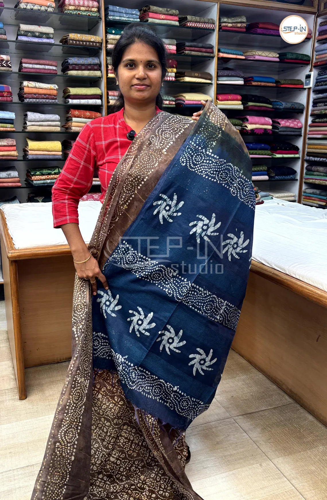 Batik Printed Banswara Cotton Saree - Grey & Blue