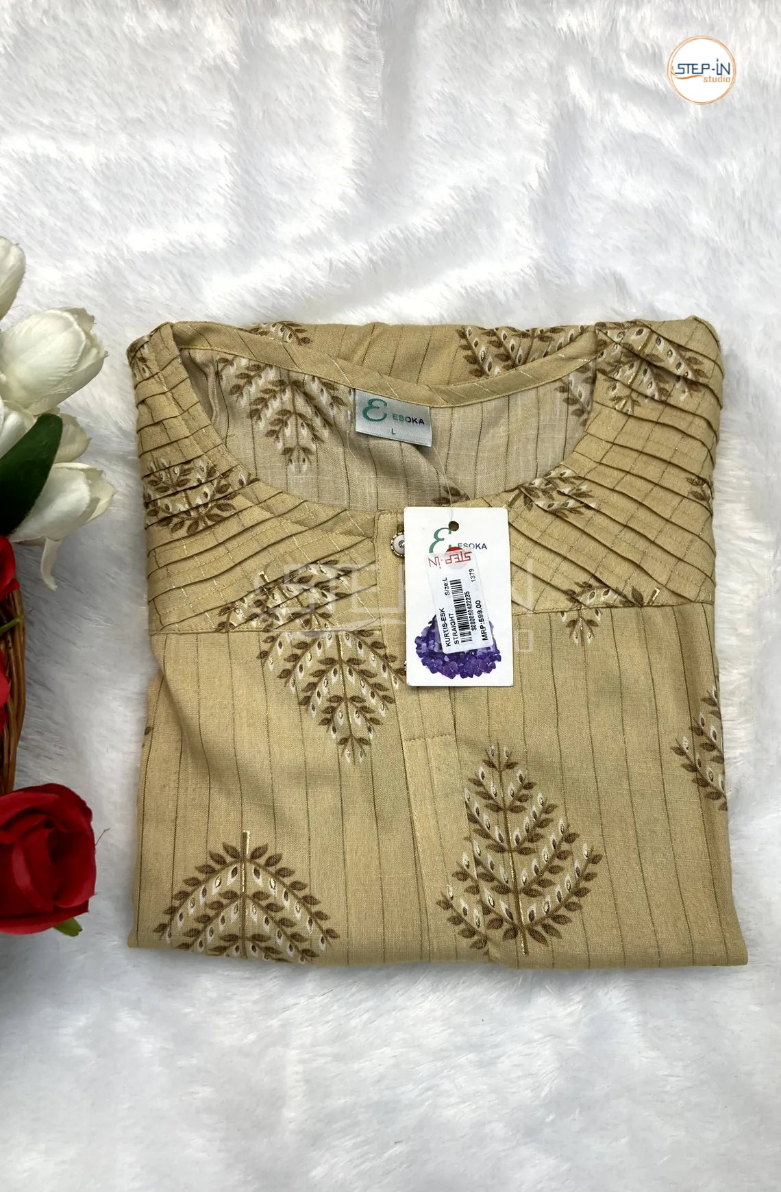 The Floral Striped Printed Cotton Top in Sandal features a refined combination of delicate floral motifs and subtle stripes, crafted on breathable cotton fabric. Its warm sandal tone enhances the understated yet sophisticated design, ensuring all-day comfort without compromising style. This expertly tailored top is ideal for elevating casual ensembles with a touch of elegance and natural ease.