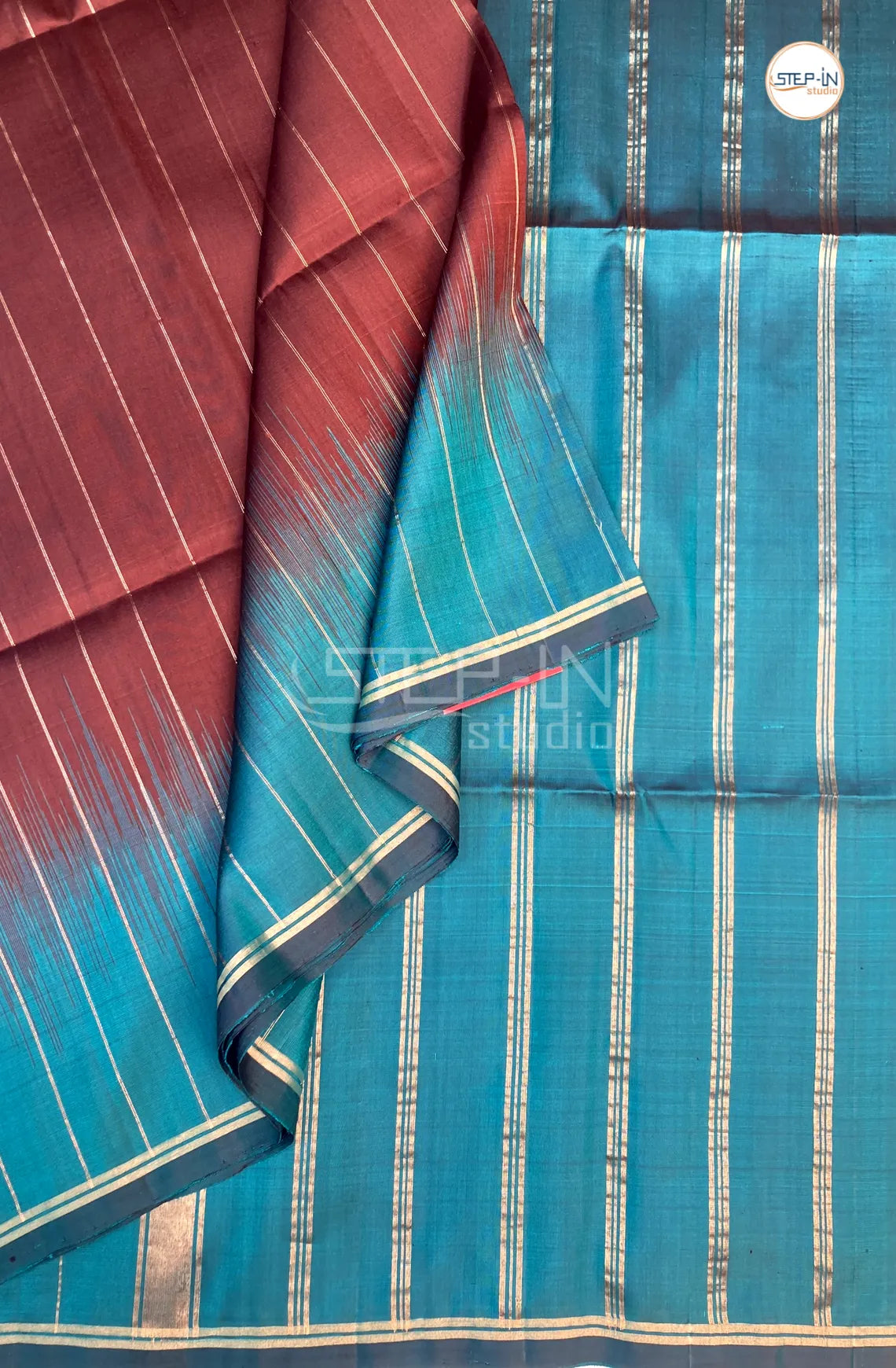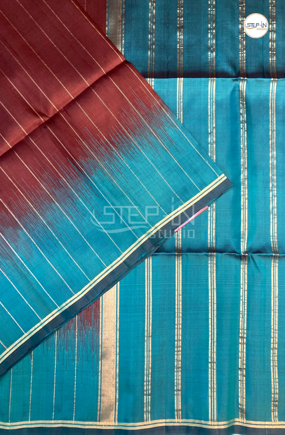 Elevate your ethnic wardrobe with this exquisite soft silk saree, meticulously crafted to showcase timeless elegance. The saree features intricate gold zari lines that create a sophisticated linear pattern throughout the fabric, adding depth and dimension to every drape. The striking maroon base provides a rich, luxurious foundation, while the contrasting green blouse piece and pallu offer a contemporary twist on traditional styling. Woven from premium soft silk, this saree drapes beautifully and feels gentle against the skin, making it ideal for both festive occasions and special celebrations. The carefully coordinated color palette ensures effortless coordination, allowing you to create a polished, cohesive look with minimal accessorizing. Perfect for those who appreciate refined craftsmanship and classic design elements.
