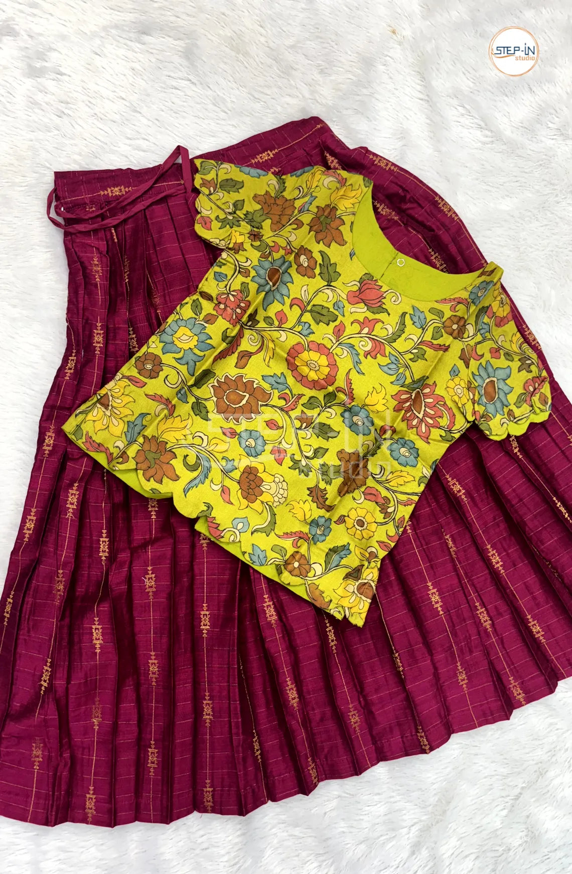 Green Kalamkari Top With Raw Silk Kumkum Skirt